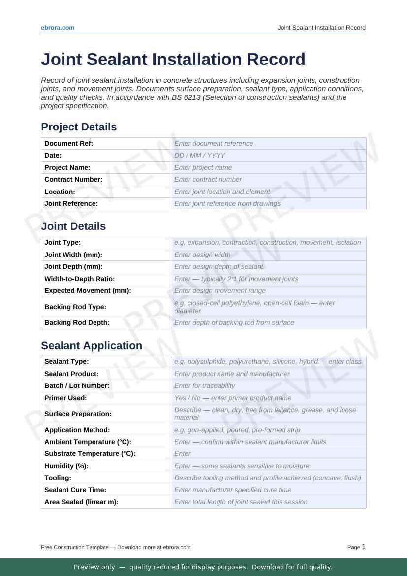 Free Word template: Joint Sealant Installation Record. Download for UK construction sites.