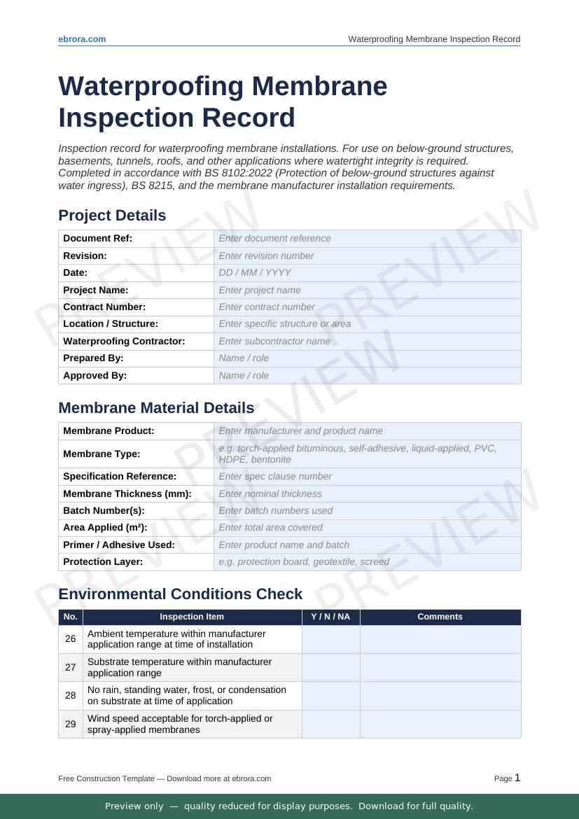 Free Word template: Waterproofing Membrane Inspection Record. Download for UK construction sites.