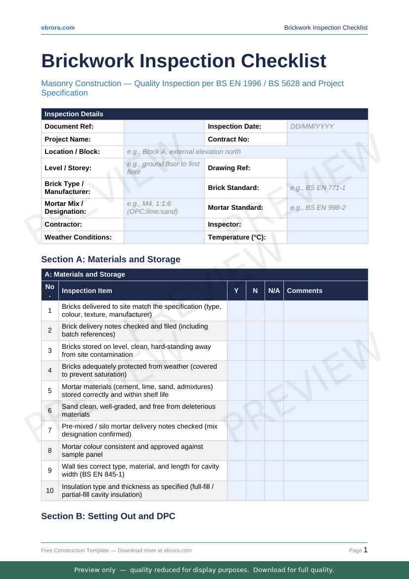 Free Word template: Brickwork Inspection Checklist. Download for UK construction sites.