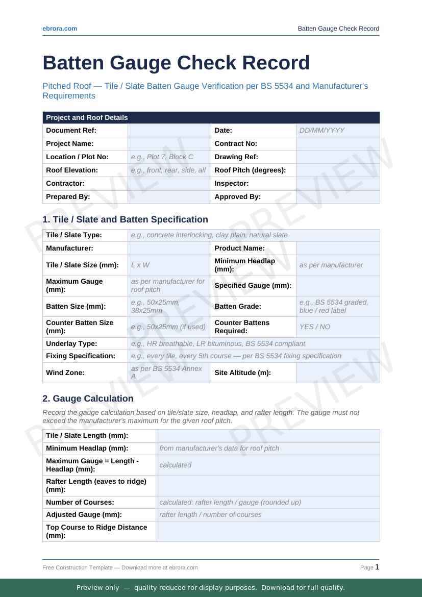 Roof covering inspection checklists, batten gauge records, and flat roof installation logs.