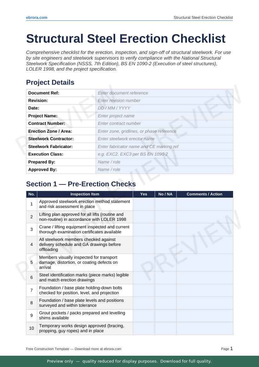 Free Word template: Structural Steel Erection Checklist. Download for UK construction sites.