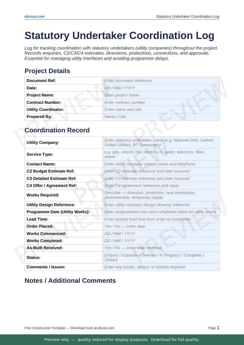 Free Word template: Statutory Undertaker Coordination Log. Download for UK construction sites.