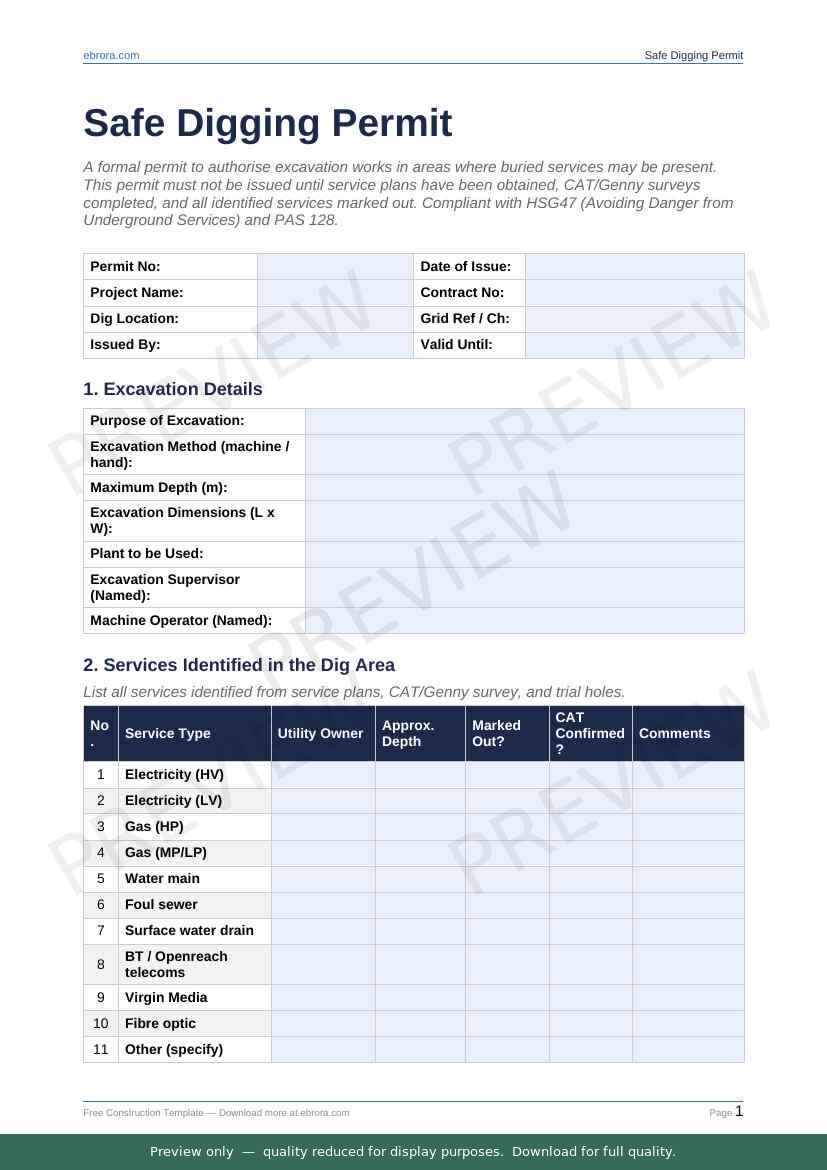 Free Word template: Safe Digging Permit. Download for UK construction sites.