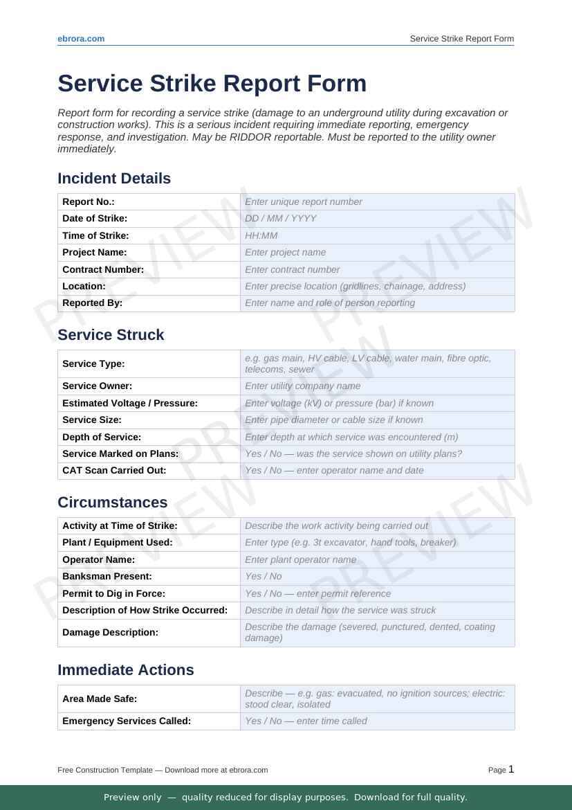 Free Word template: Service Strike Report Form. Download for UK construction sites.