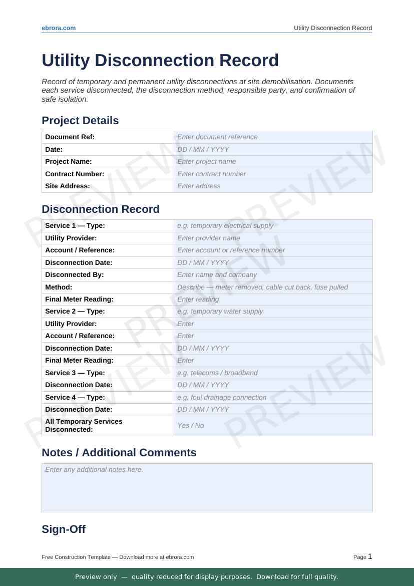 Free Word template: Utility Disconnection Record. Download for UK construction sites.