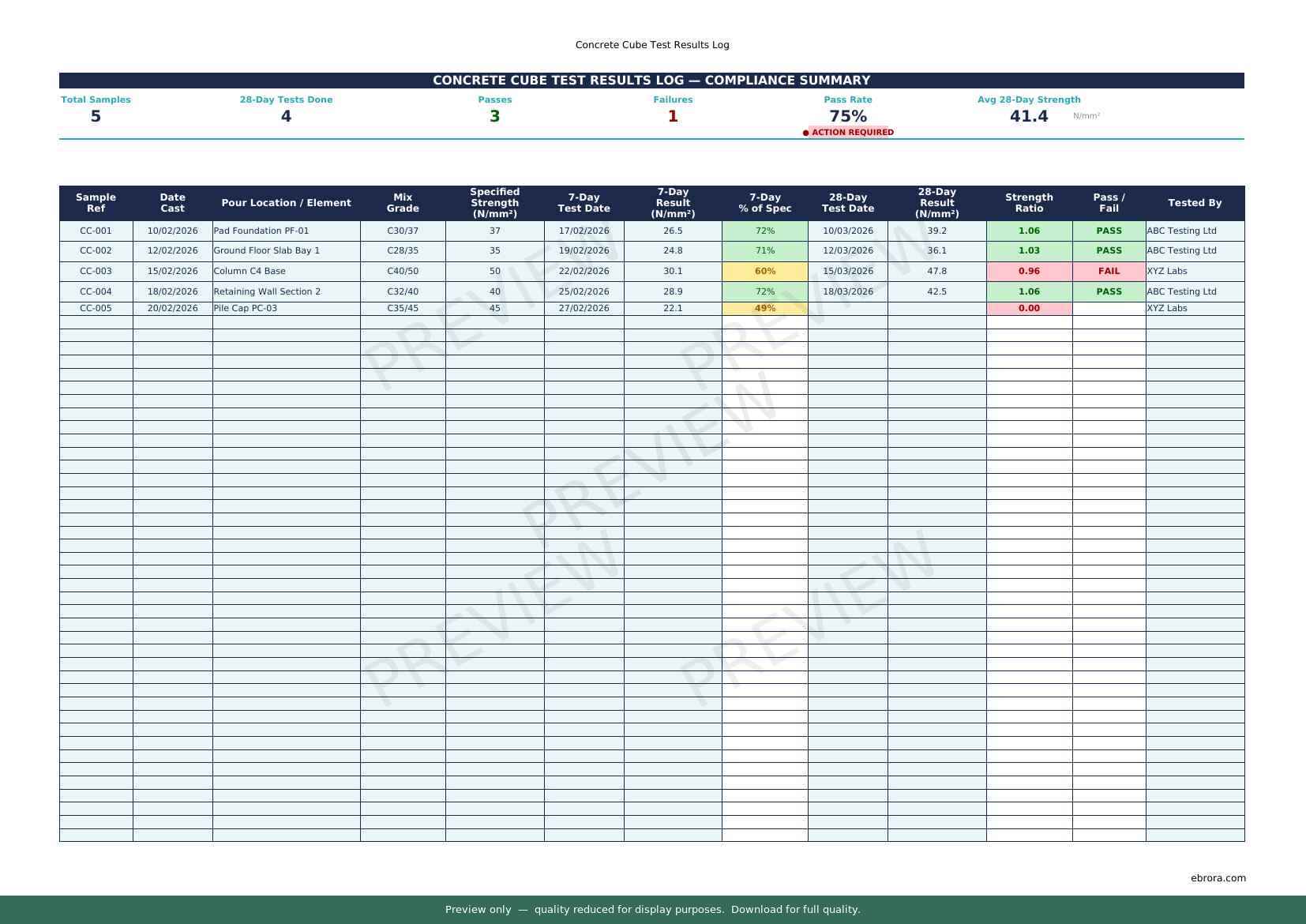 Free Excel template: Concrete Cube Test Results Log. Download for UK construction sites.