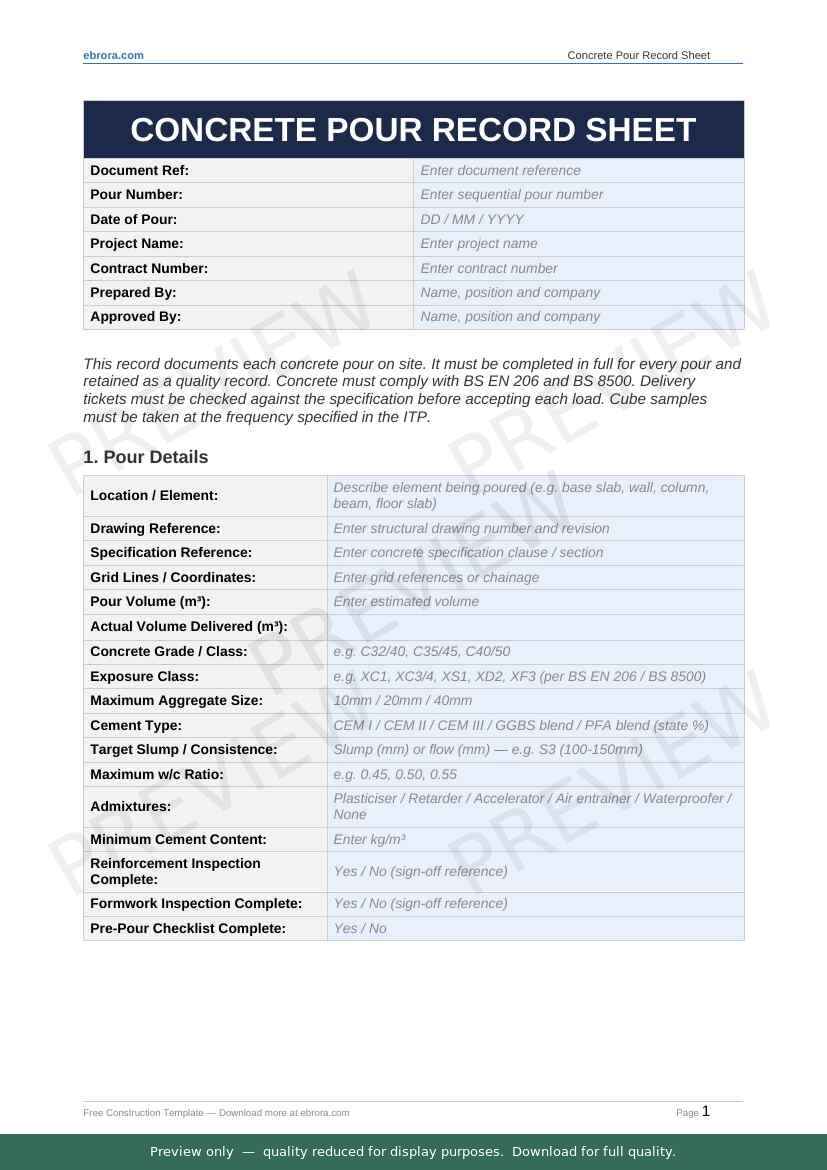 Free Word template: Concrete Pour Record Sheet. Download for UK construction sites.