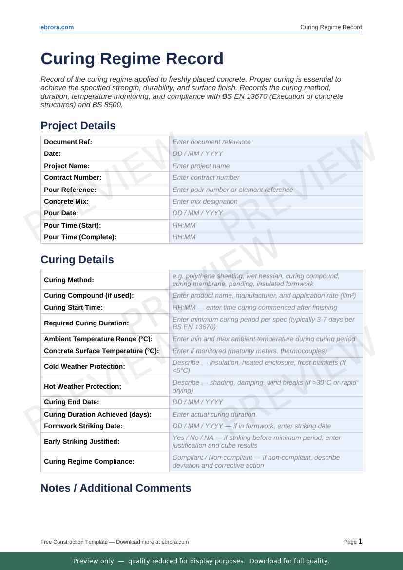 Free Word template: Curing Regime Record. Download for UK construction sites.