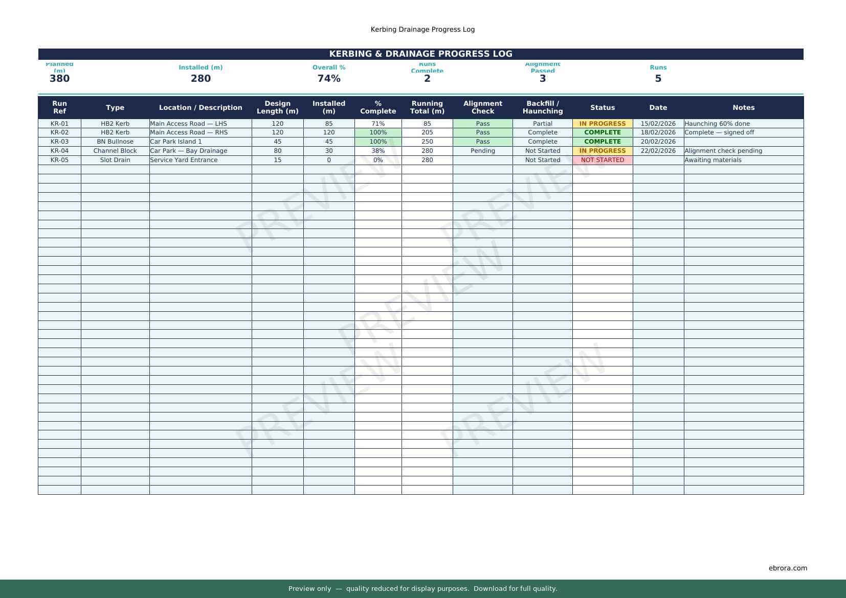 Free Excel template: Kerbing Drainage Progress Log. Download for UK construction sites.