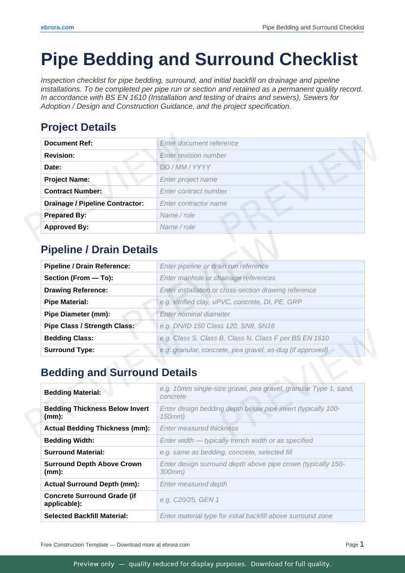 Free Word template: Pipe Bedding and Surround Checklist. Download for UK construction sites.