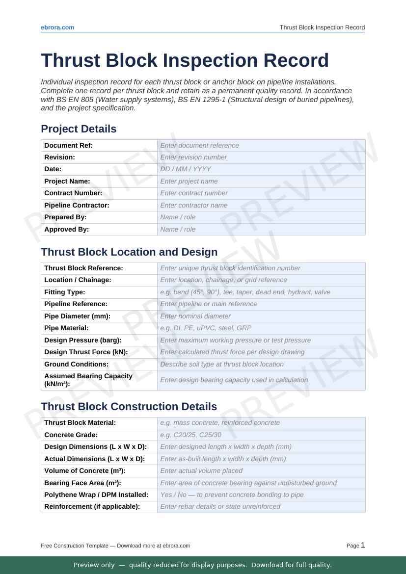 Free Word template: Thrust Block Inspection Record. Download for UK construction sites.