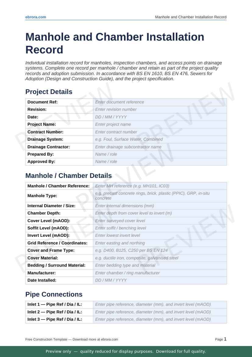 Free Word template: Manhole and Chamber Installation Record. Download for UK construction sites.