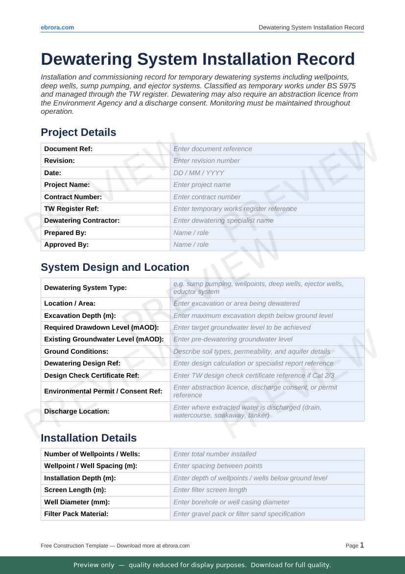 Free Word template: Dewatering System Installation Record. Download for UK construction sites.