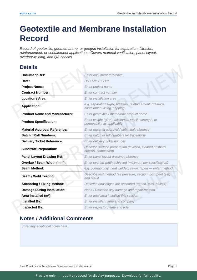 Free Word template: Geotextile and Membrane Installation Record. Download for UK construction sites.