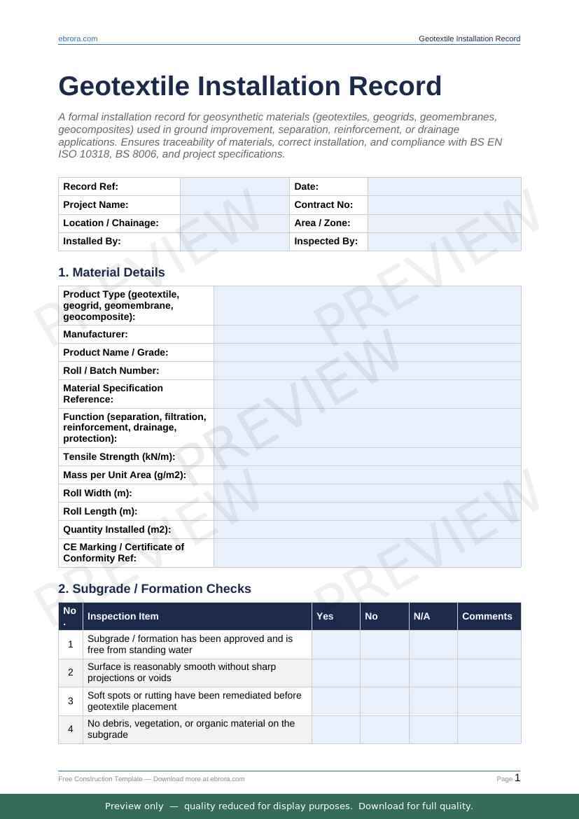 Free Word template: Geotextile Installation Record. Download for UK construction sites.