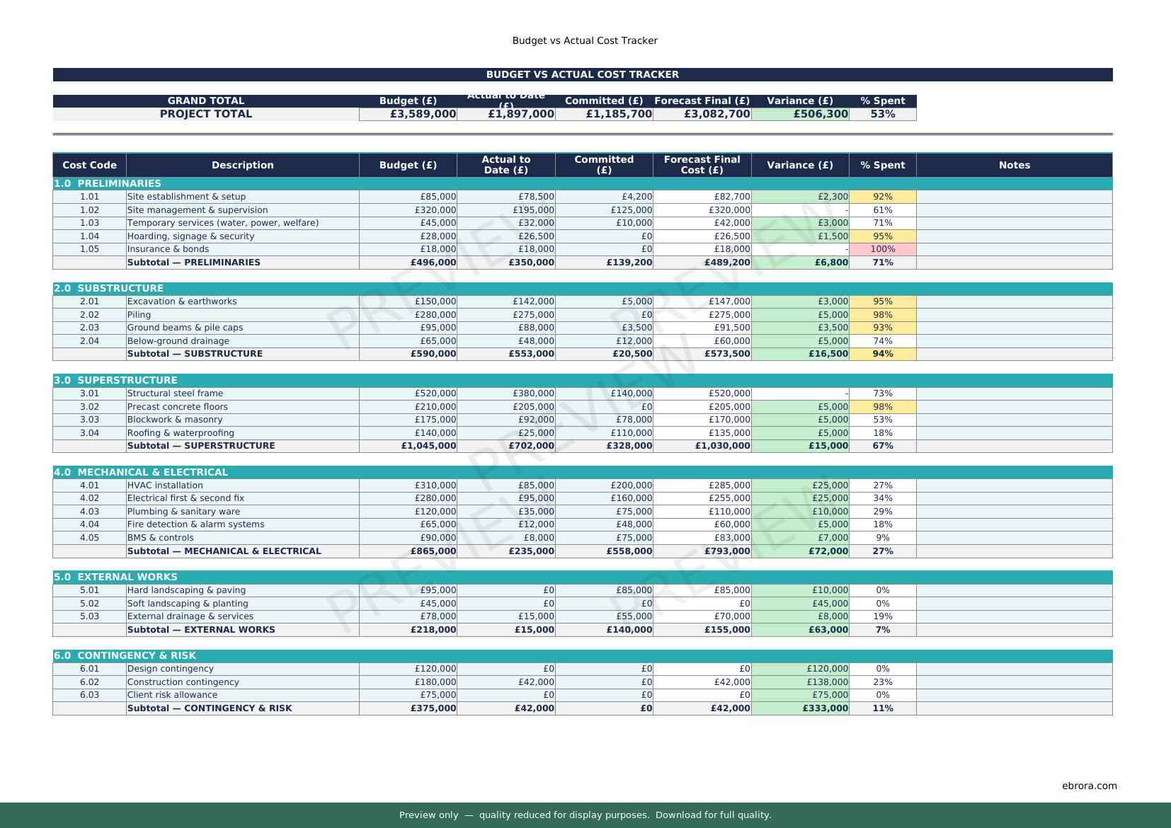 Free Excel template: Budget Vs Actual Cost Tracker. Download for UK construction sites.
