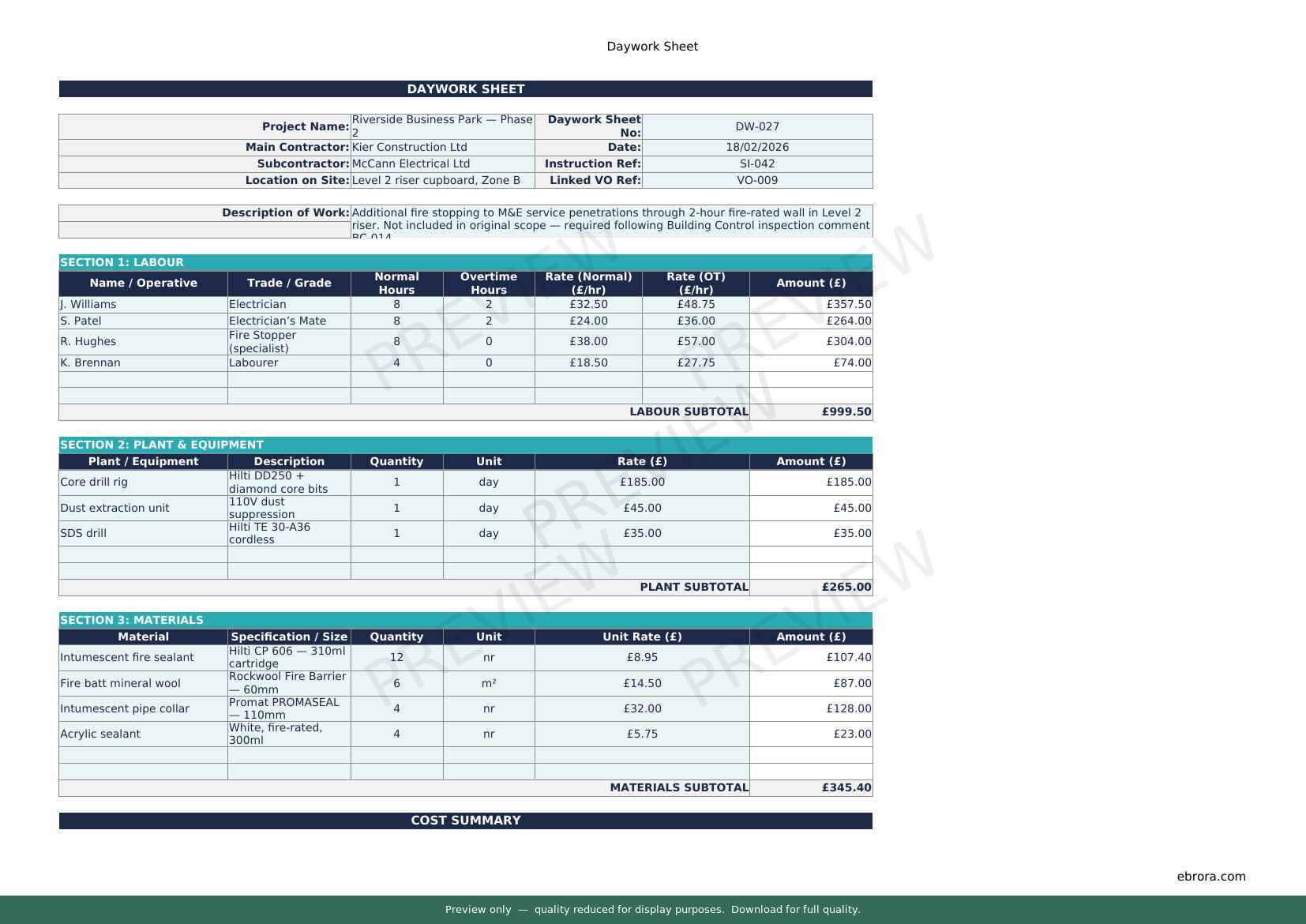 Free Excel template: Daywork Sheet. Download for UK construction sites.