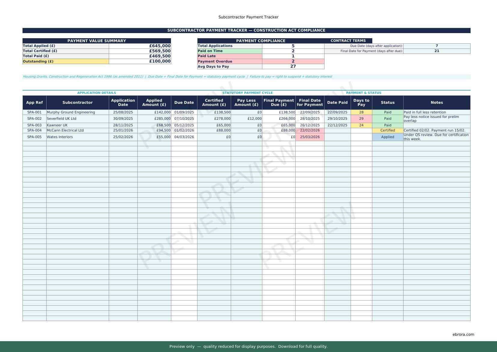 Free Excel template: Subcontractor Payment Tracker. Download for UK construction sites.