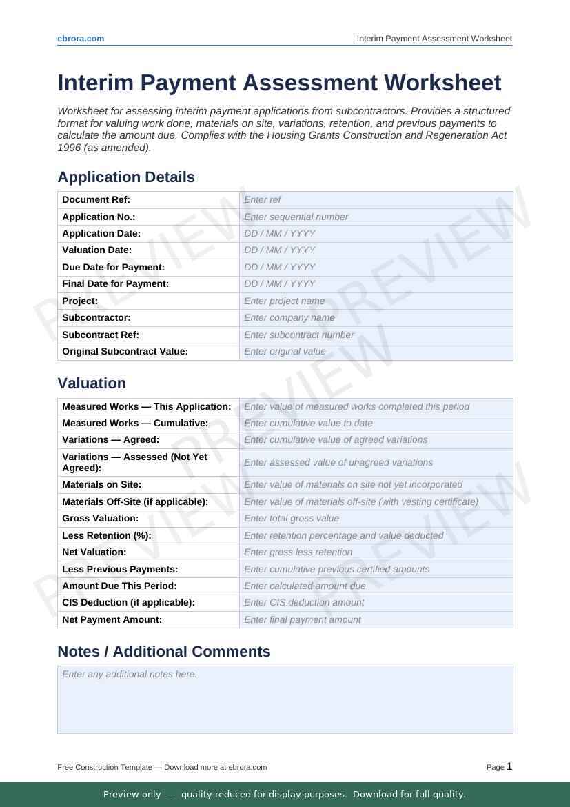 Free Word template: Interim Payment Assessment Worksheet. Download for UK construction sites.