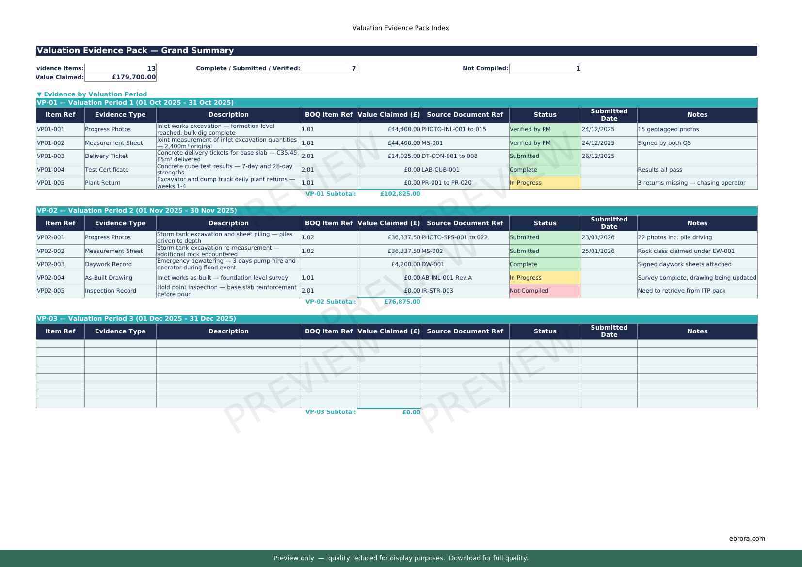Free Excel template: Valuation Evidence Pack Index. Download for UK construction sites.