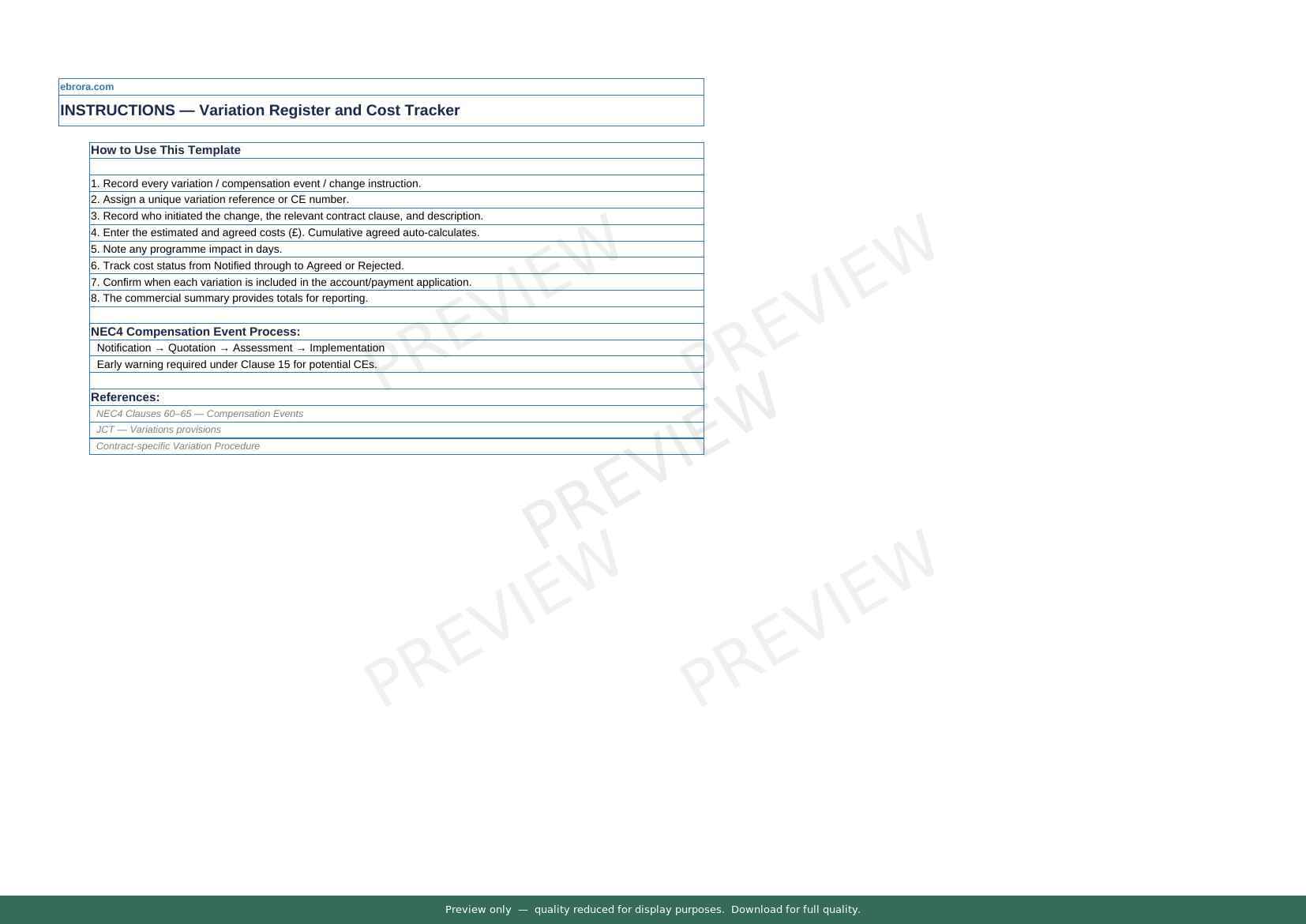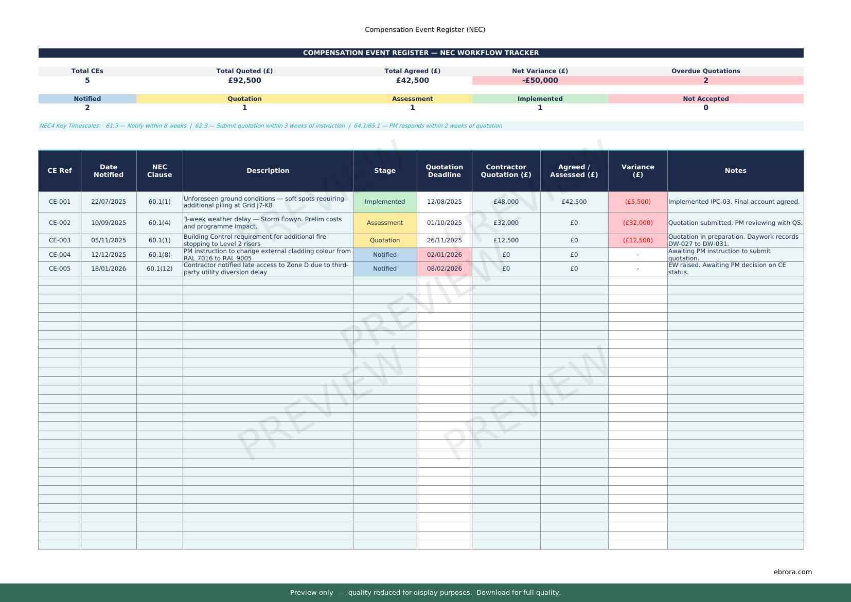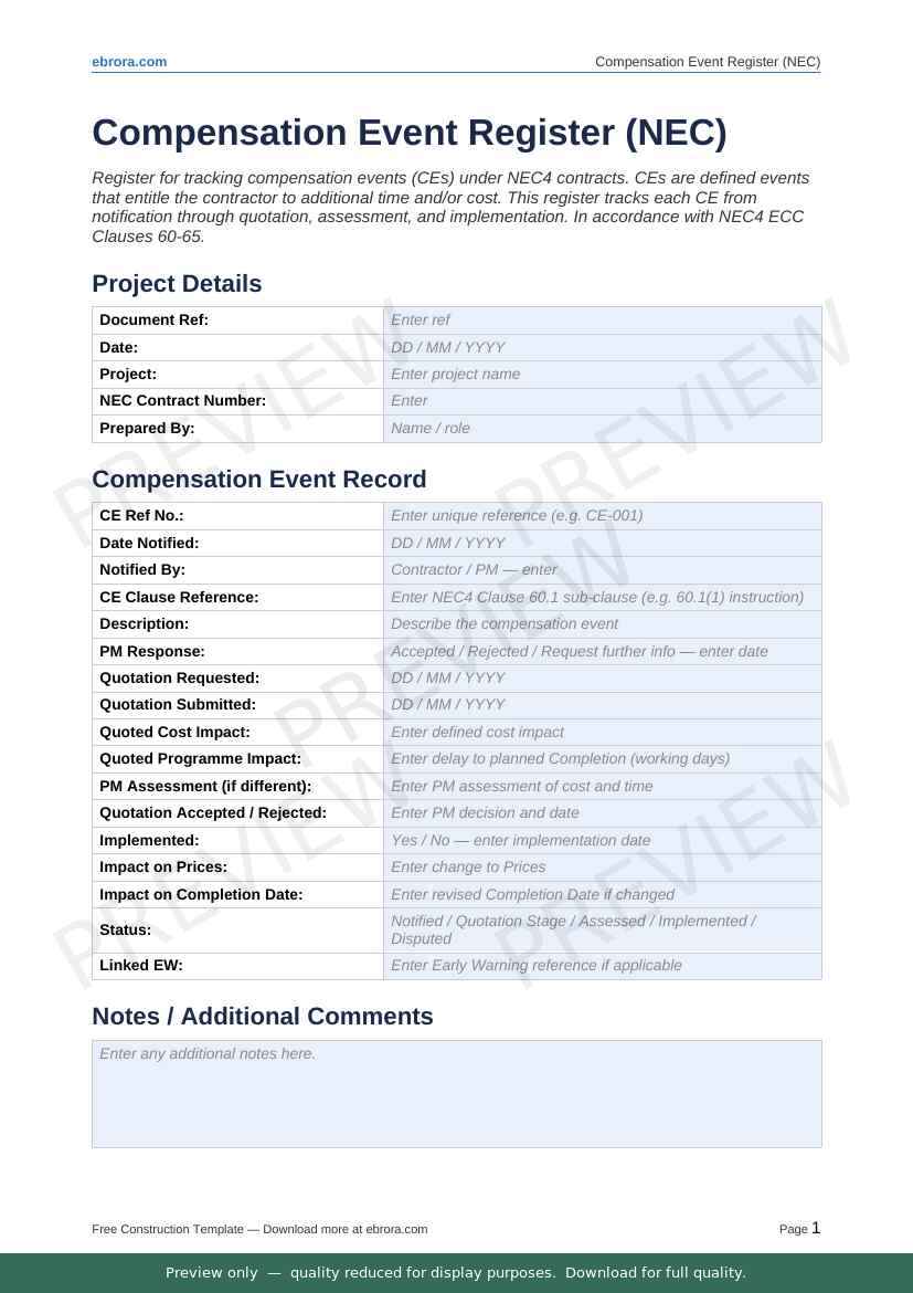 Free Excel template: Compensation Event Register Nec. Download for UK construction sites.