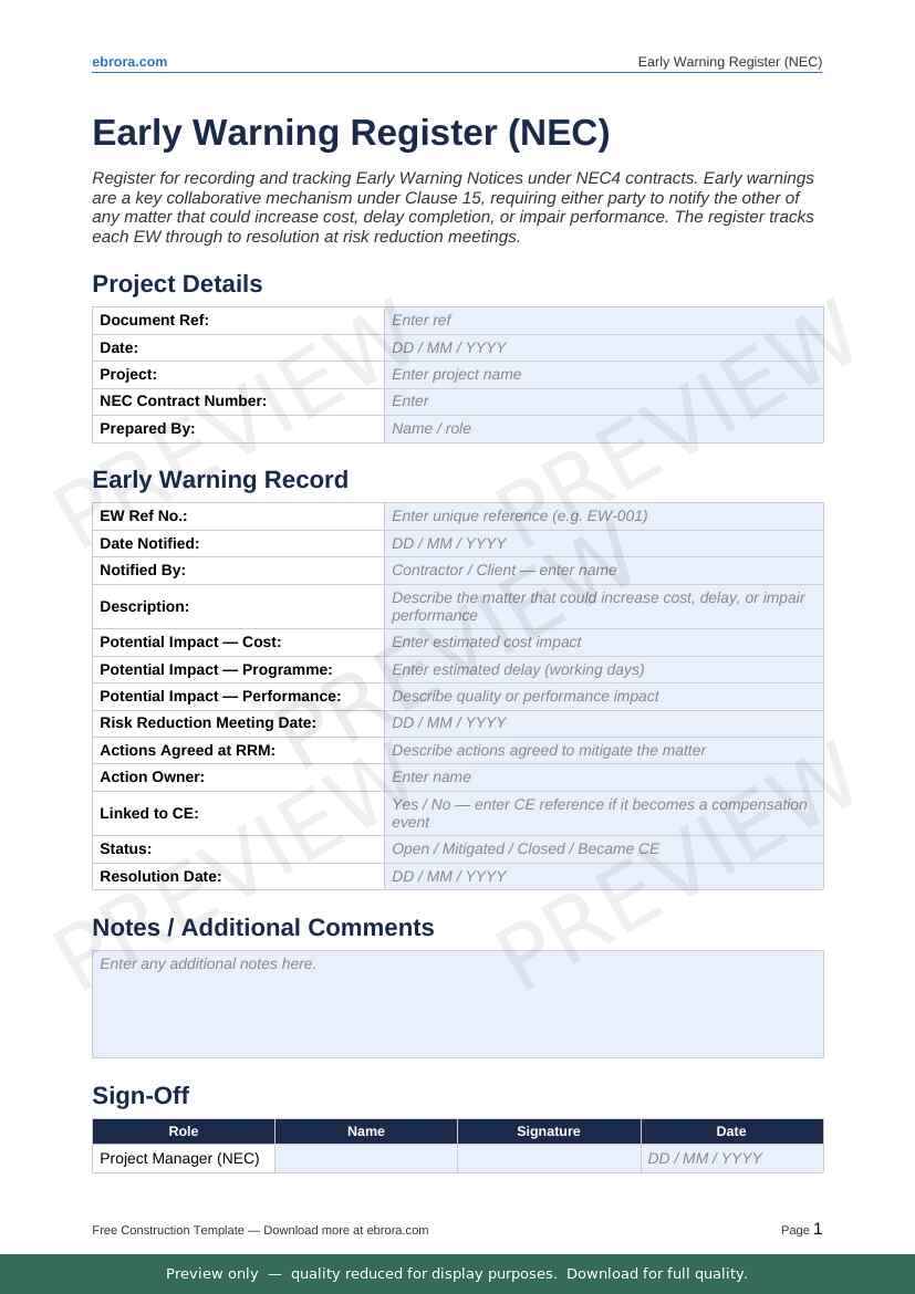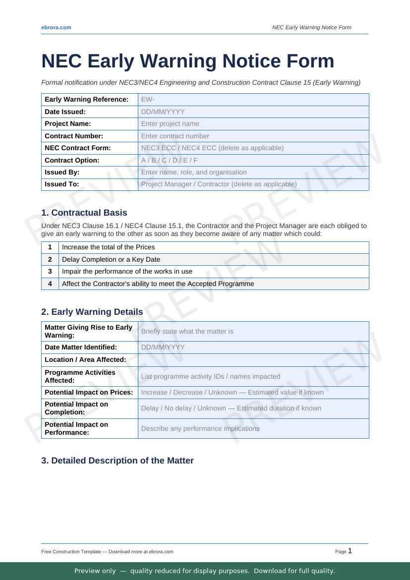 Free Word template: Nec Early Warning Notice Form. Download for UK construction sites.