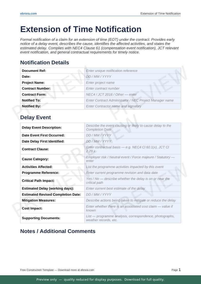 Free Word template: Extension of Time Notification. Download for UK construction sites.
