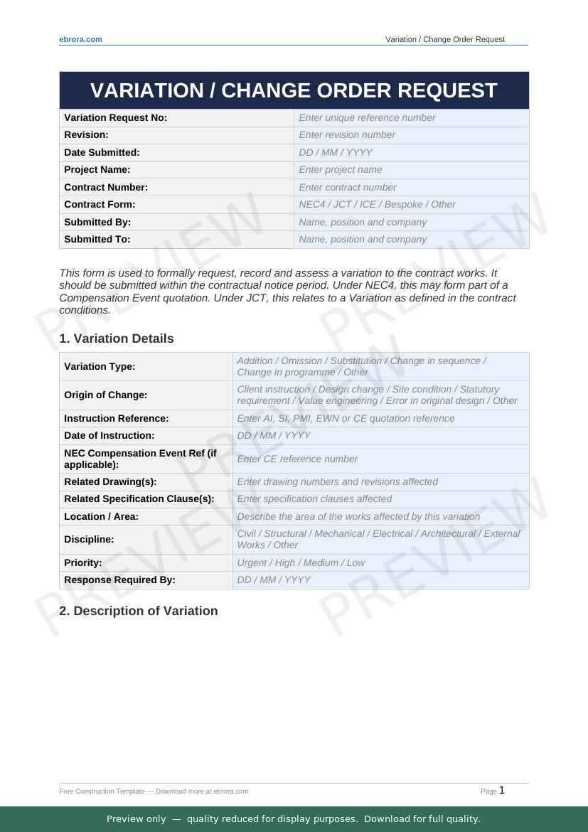 Free Word template: Variation Change Order Request. Download for UK construction sites.