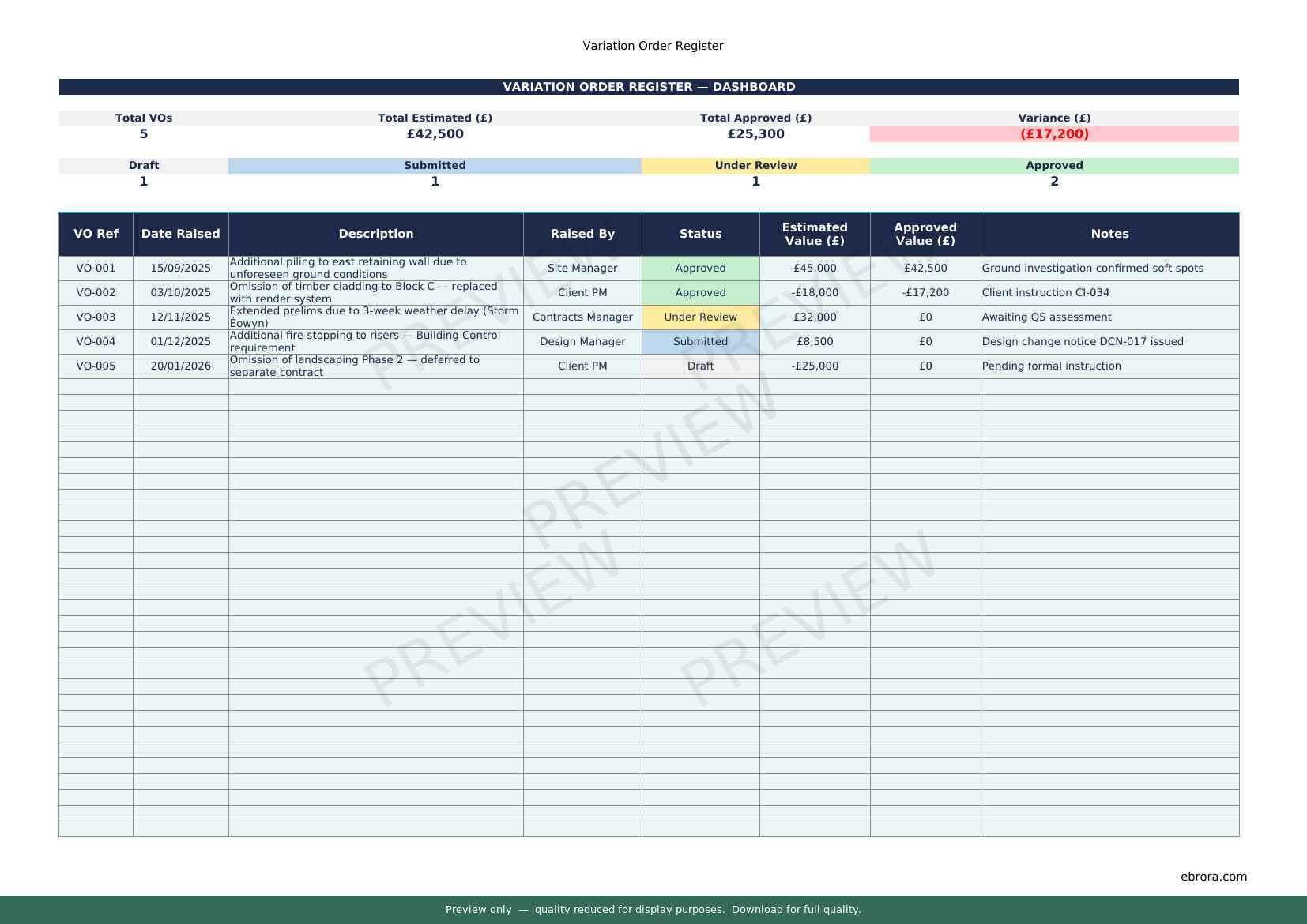 Free Excel template: Variation Order Register. Download for UK construction sites.