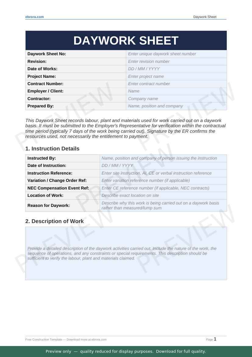 Free Word template: Daywork Sheet. Download for UK construction sites.