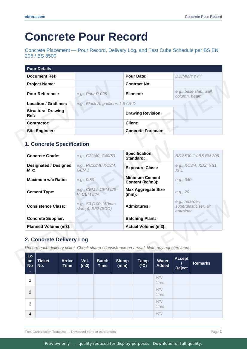 Free Word template: Concrete Pour Record. Download for UK construction sites.