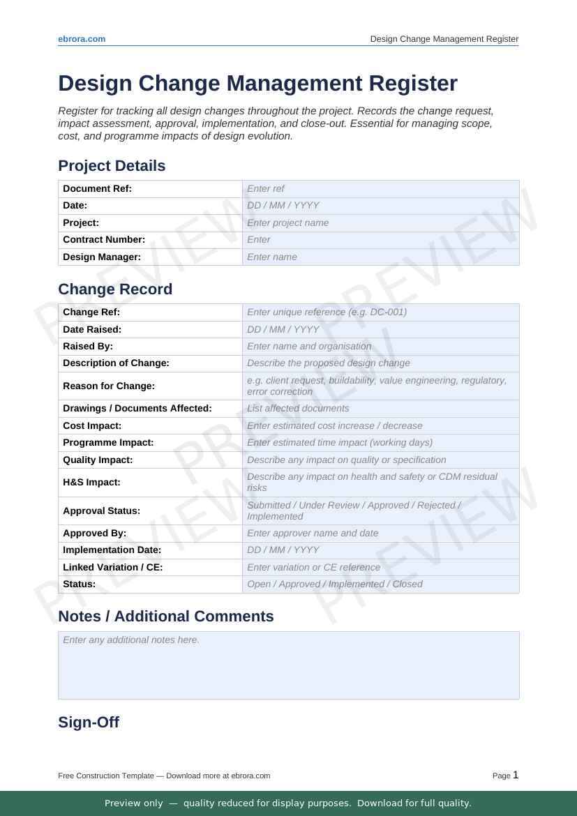 Free Word template: Design Change Management Register. Download for UK construction sites.