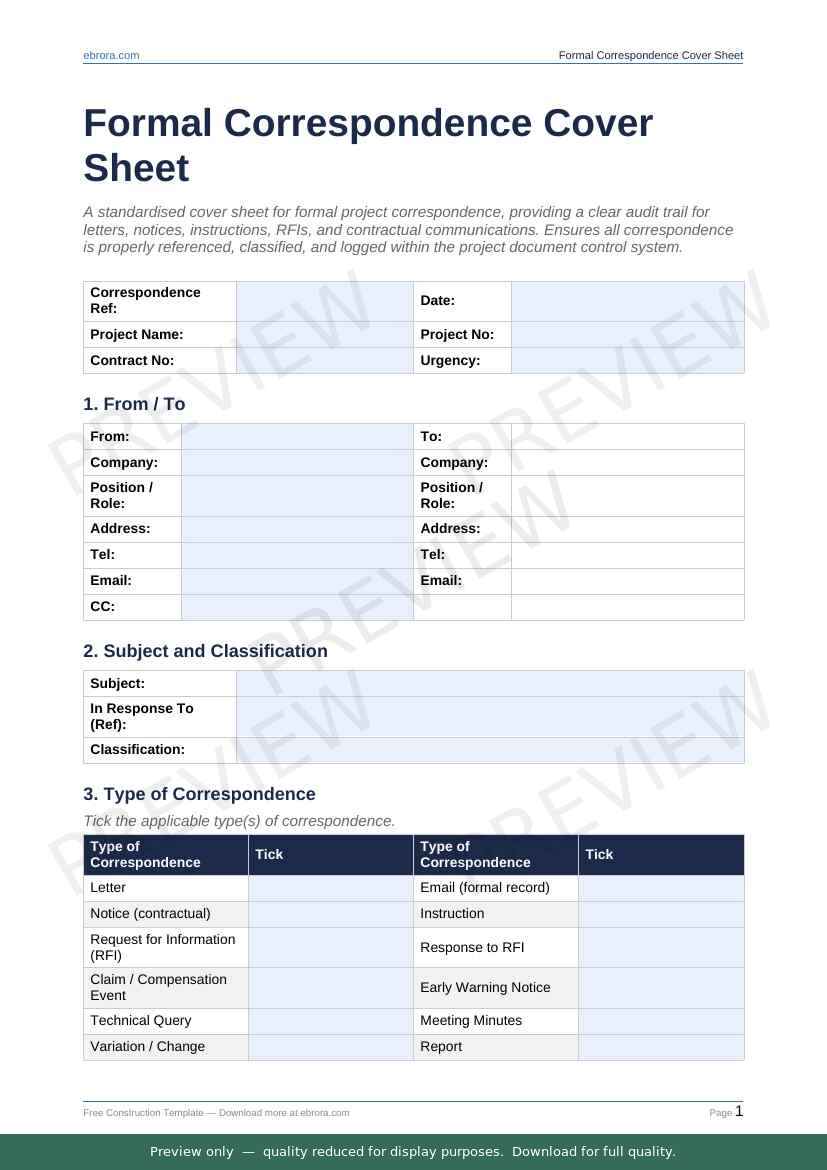 Free Word template: Formal Correspondence Cover Sheet. Download for UK construction sites.