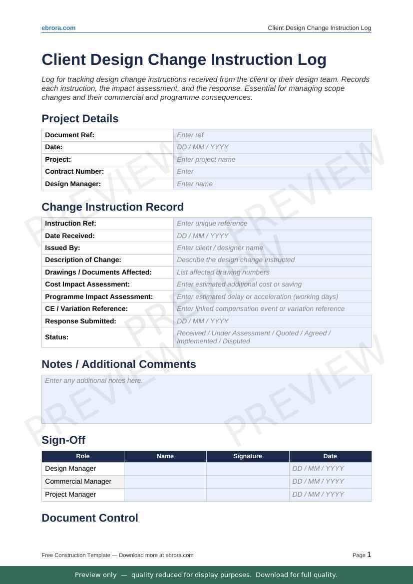Free Word template: Client Design Change Instruction Log. Download for UK construction sites.