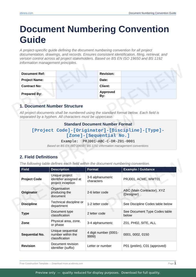 Free Word template: Document Numbering Convention Guide. Download for UK construction sites.