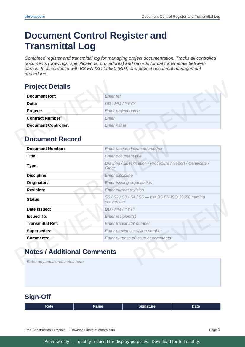 Free Word template: Document Control Register and Transmittal Log. Download for UK construction sites.