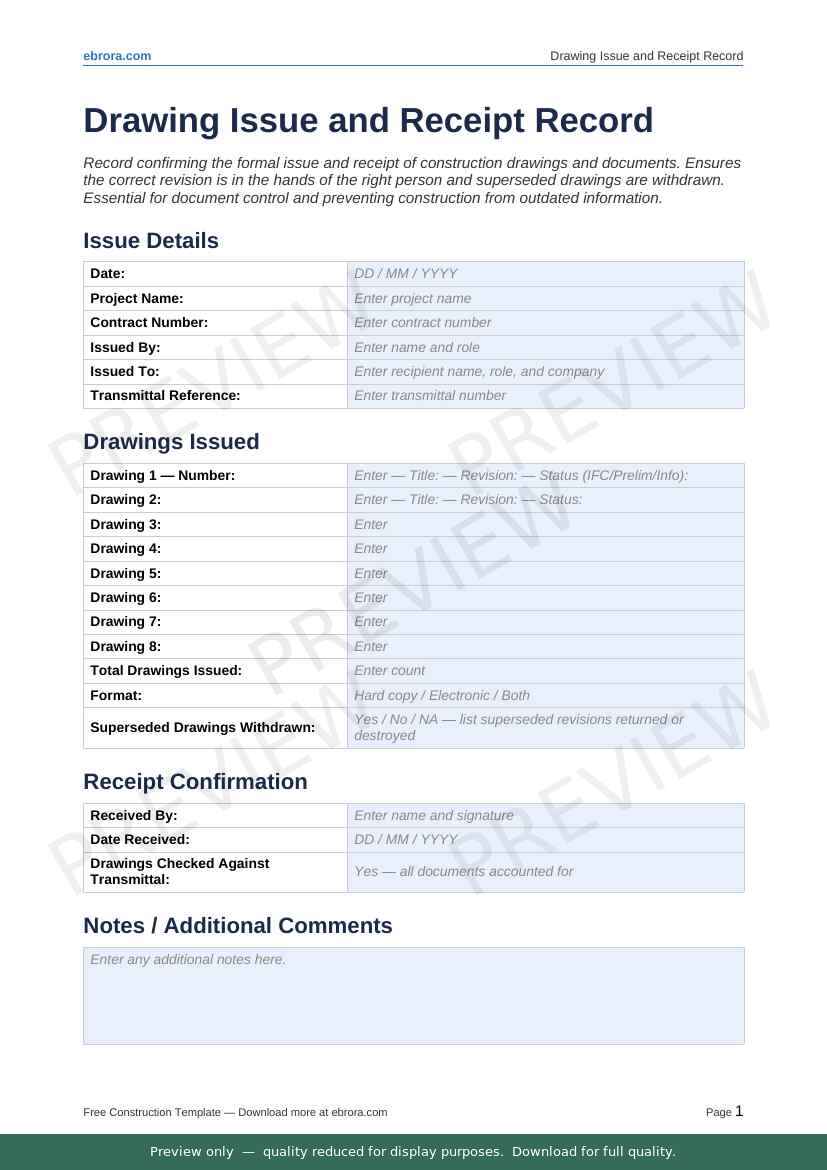 Free Word template: Drawing Issue and Receipt Record. Download for UK construction sites.
