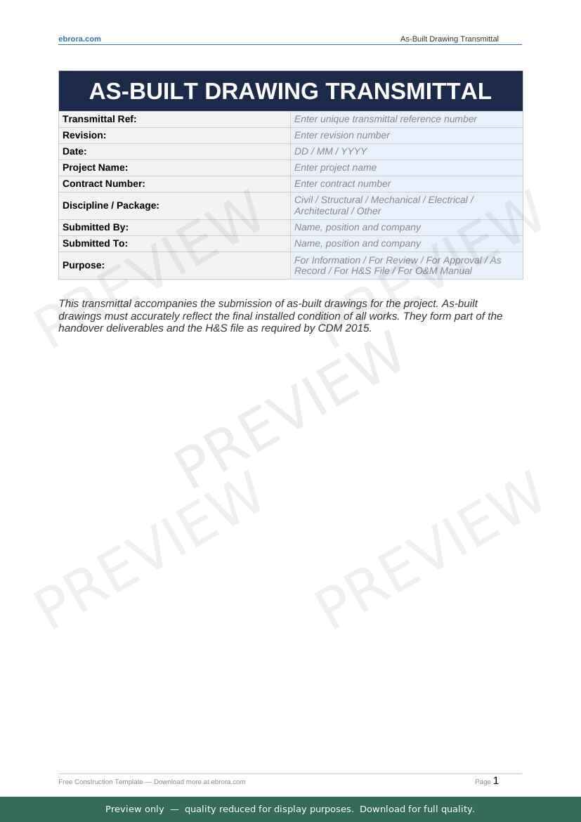 Free Word template: As Built Drawing Transmittal. Download for UK construction sites.