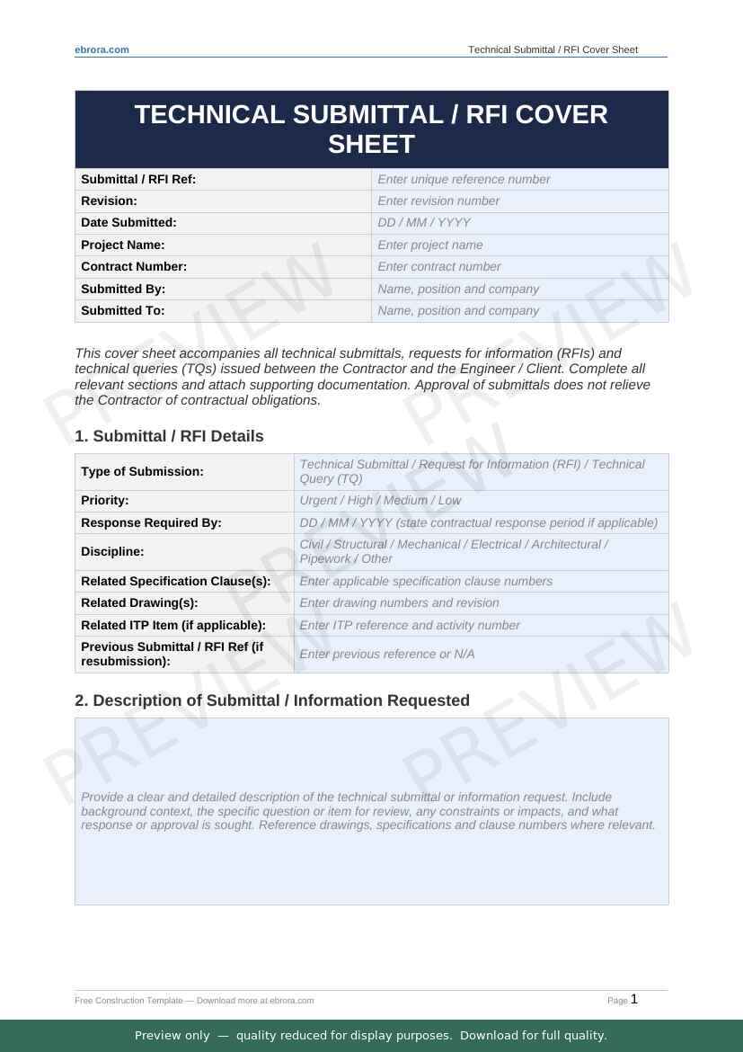Free Word template: Technical Submittal Rfi Cover Sheet. Download for UK construction sites.