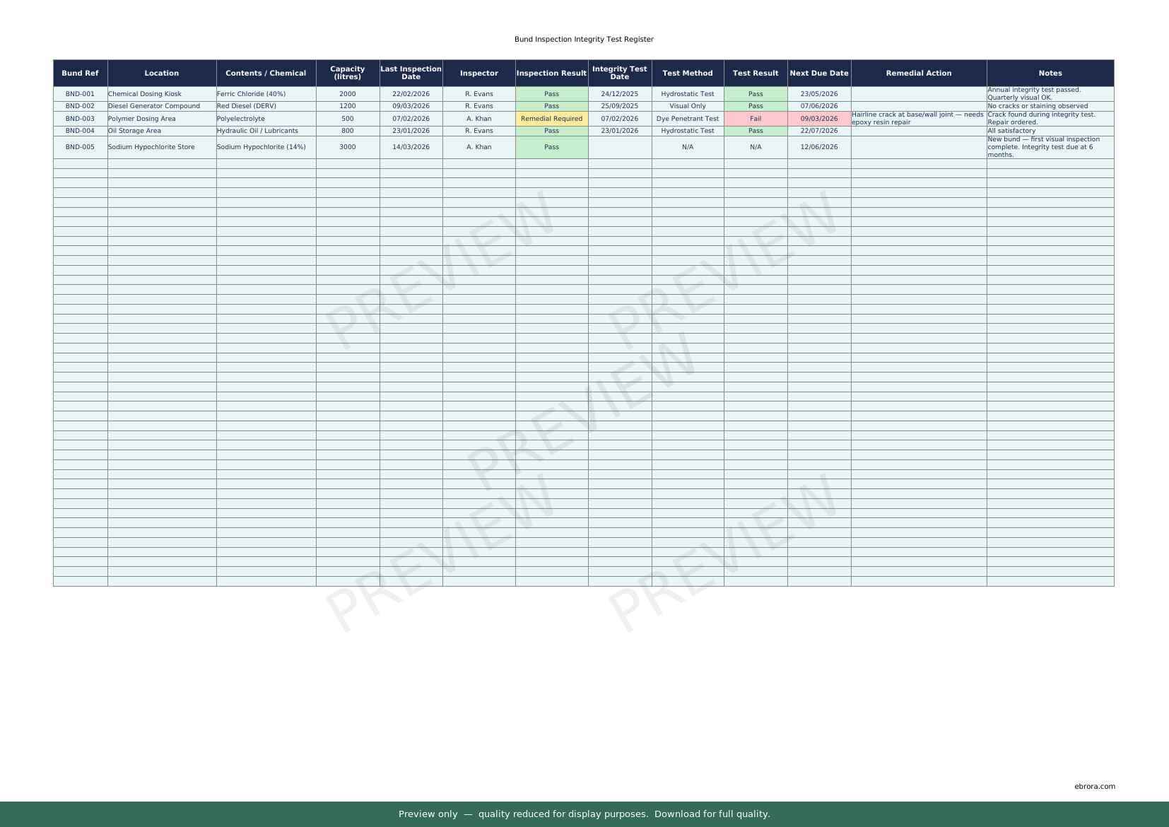 Free Excel template: Bund Inspection Register. Download for UK construction sites.