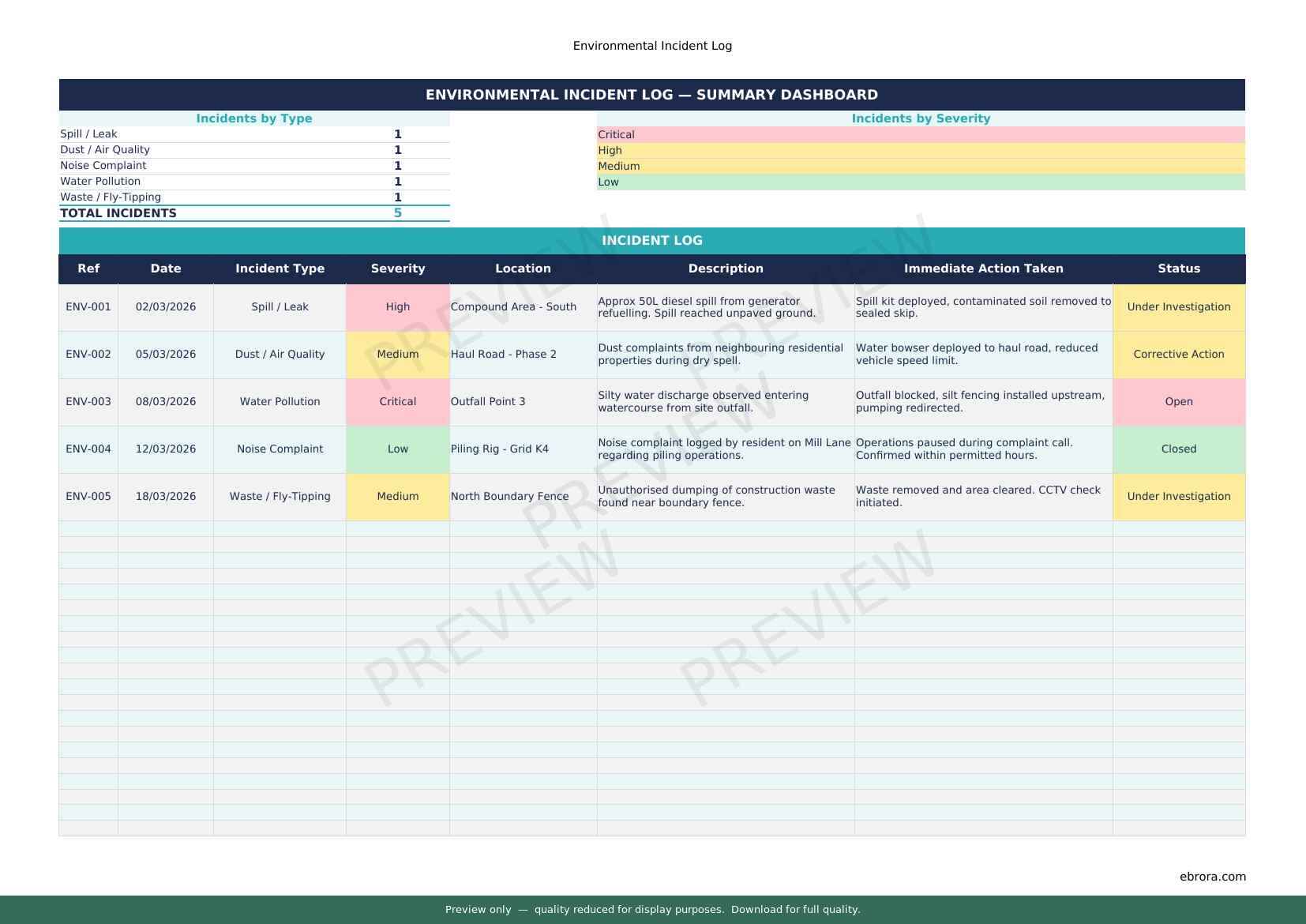 Free Excel template: Environmental Incident Log. Download for UK construction sites.