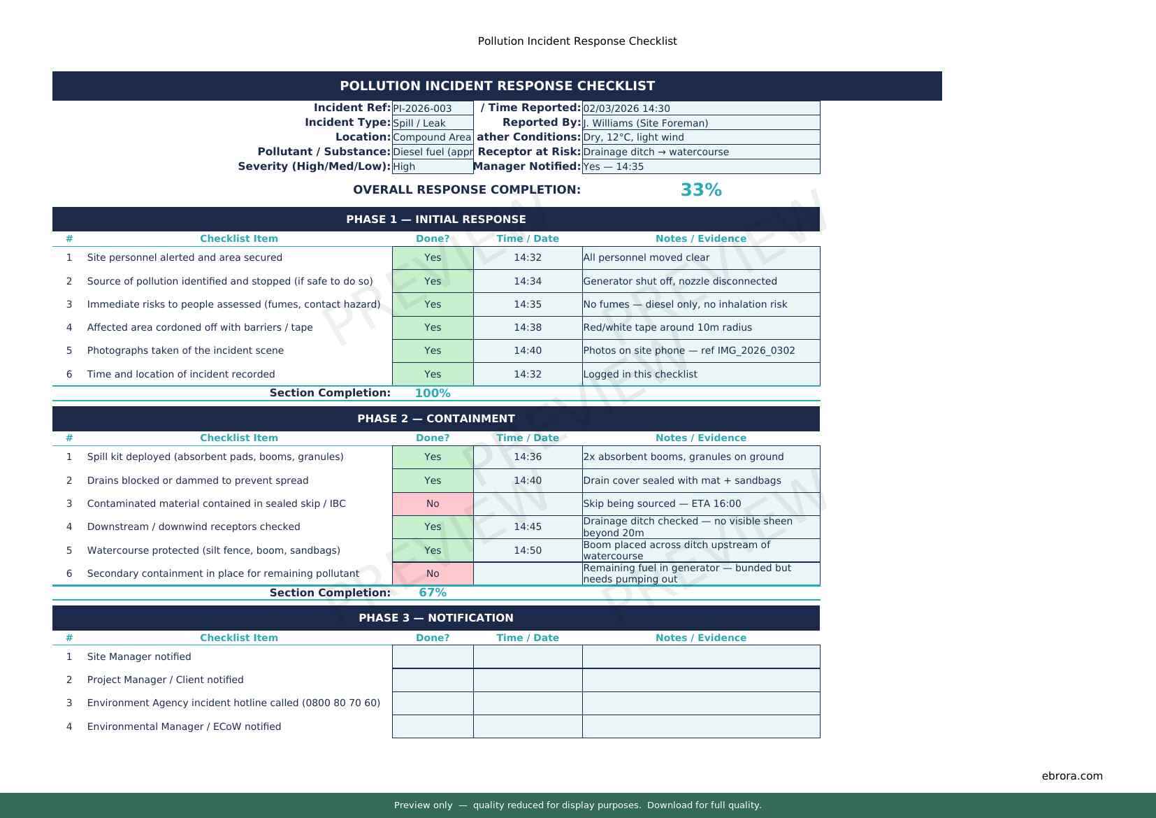 Free Excel template: Pollution Incident Response Checklist. Download for UK construction sites.
