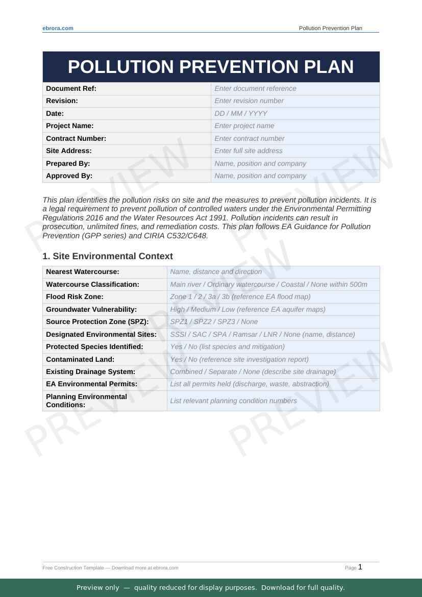 Free Word template: Pollution Prevention Plan. Download for UK construction sites.