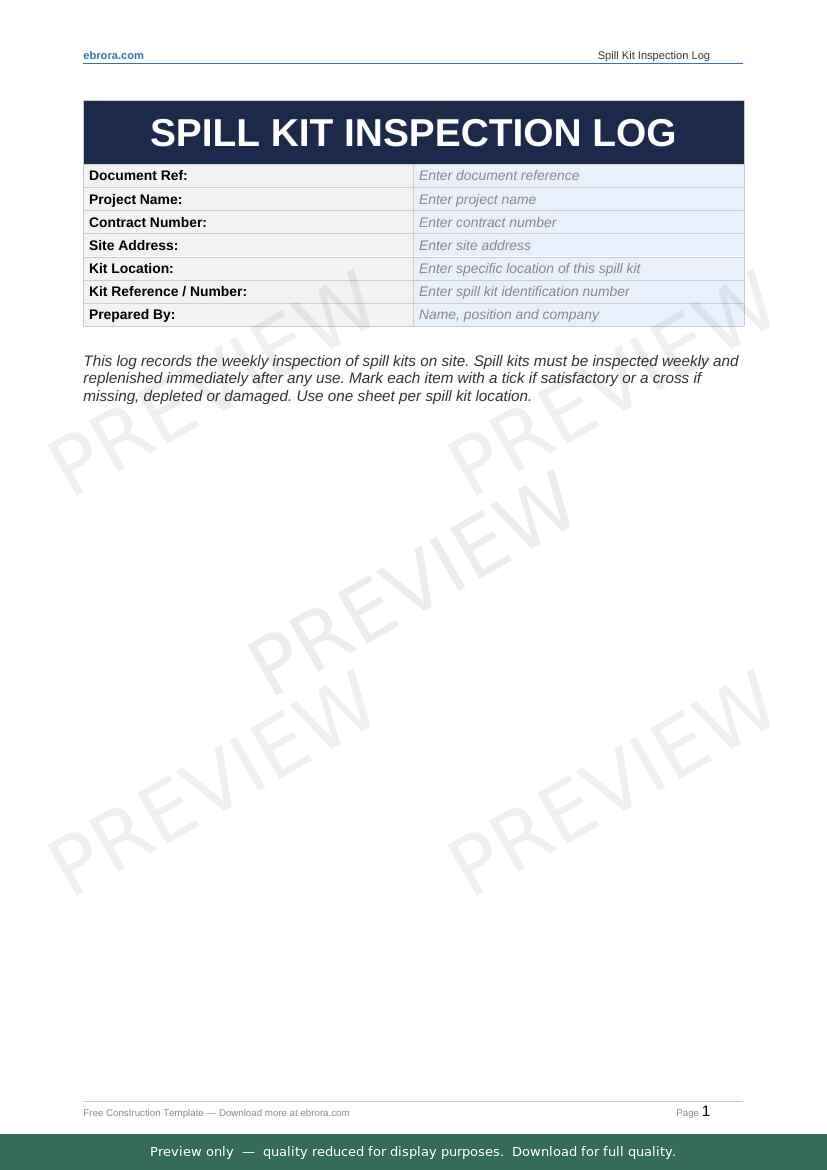 Free Word template: Spill Kit Inspection Log. Download for UK construction sites.