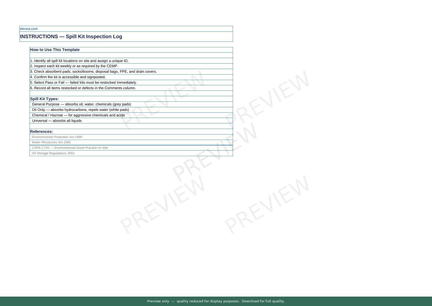 Free Excel template: Spill Kit Inspection Log. Download for UK construction sites.
