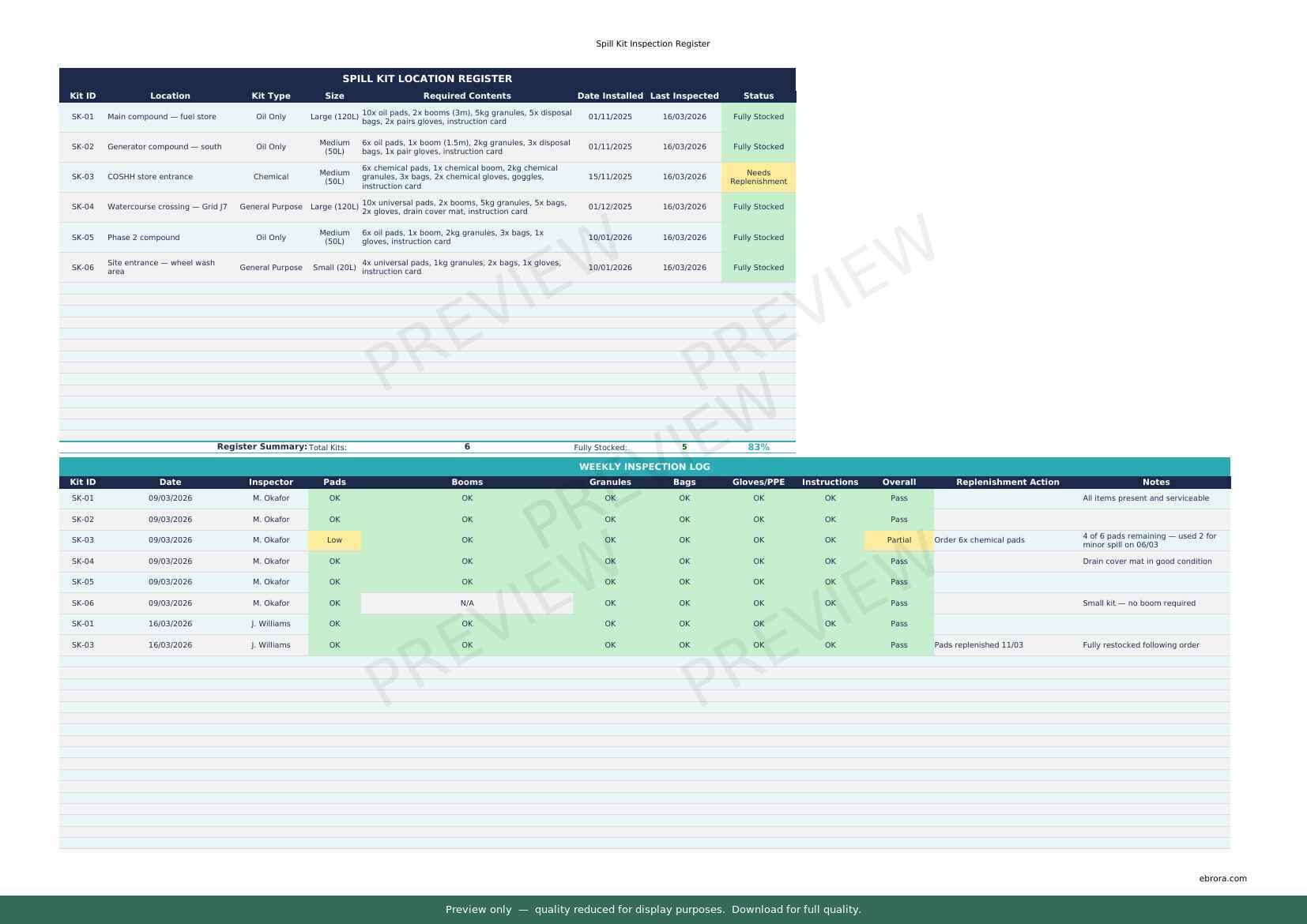 Free Excel template: Spill Kit Inspection Register. Download for UK construction sites.