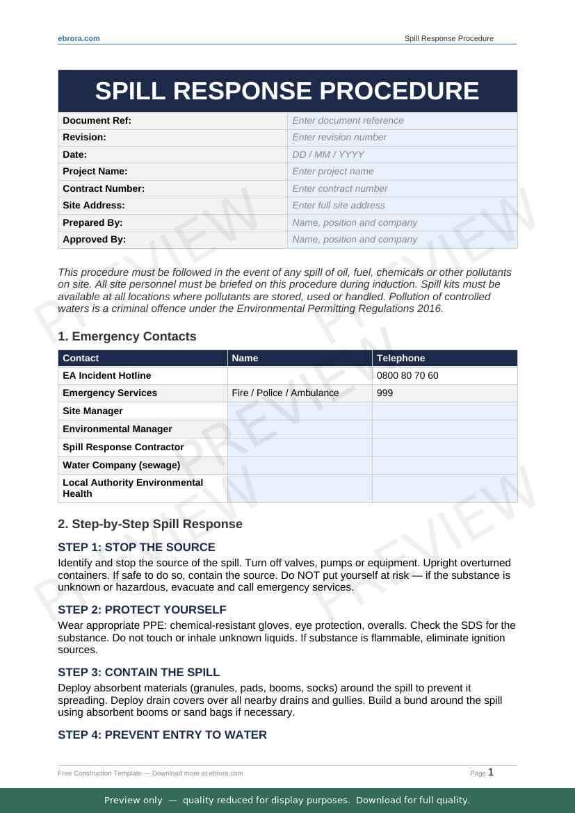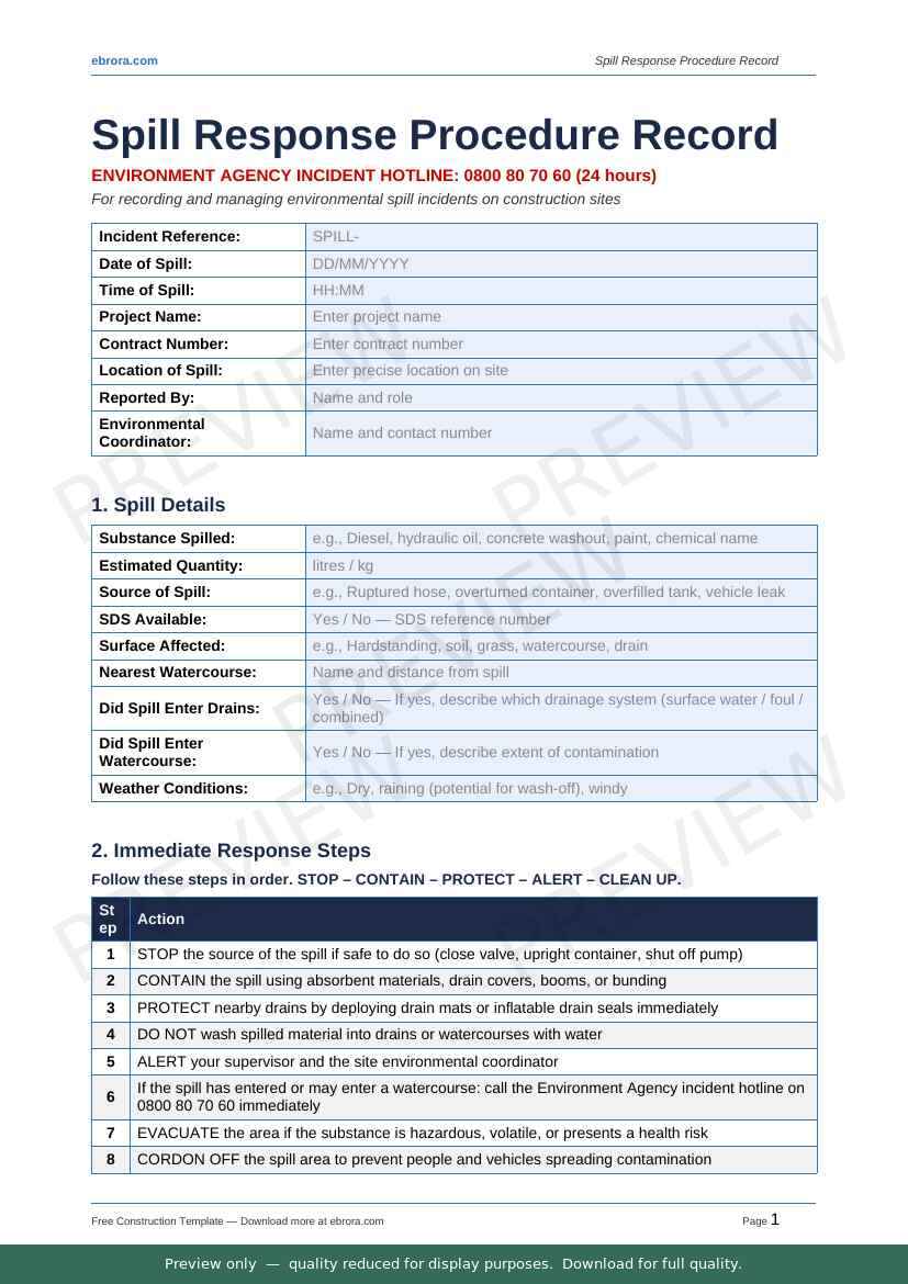 Free Word template: Spill Response Procedure. Download for UK construction sites.