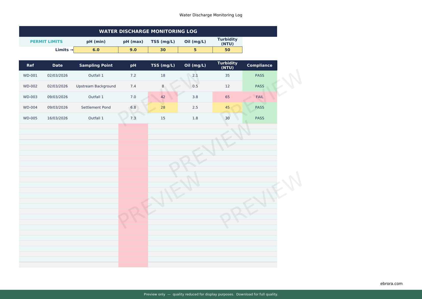 Free Excel template: Water Discharge Monitoring Log. Download for UK construction sites.
