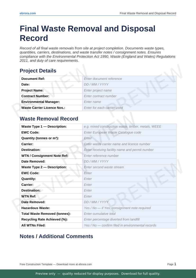 Free Word template: Final Waste Removal and Disposal Record. Download for UK construction sites.