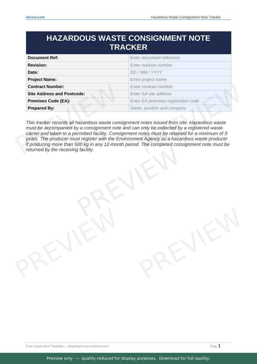 Free Word template: Hazardous Waste Consignment Note Tracker. Download for UK construction sites.